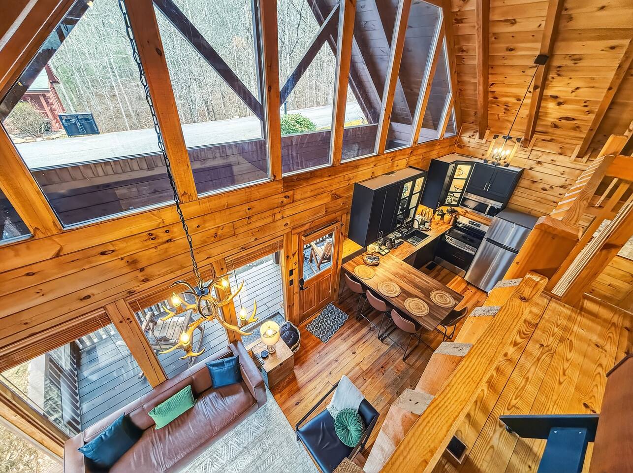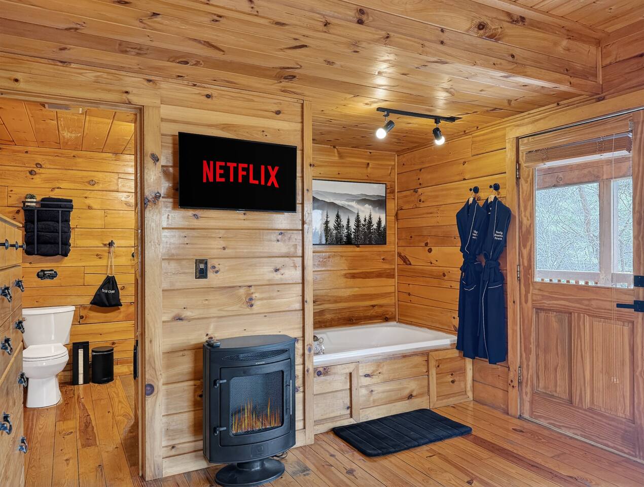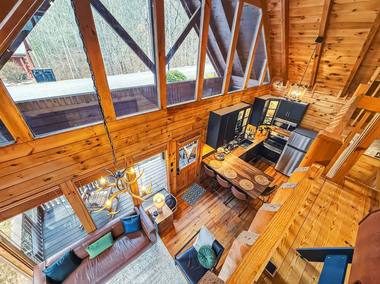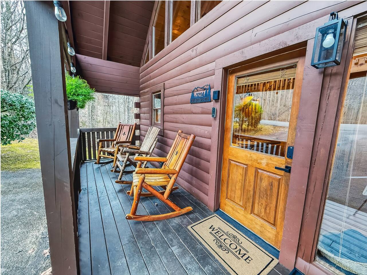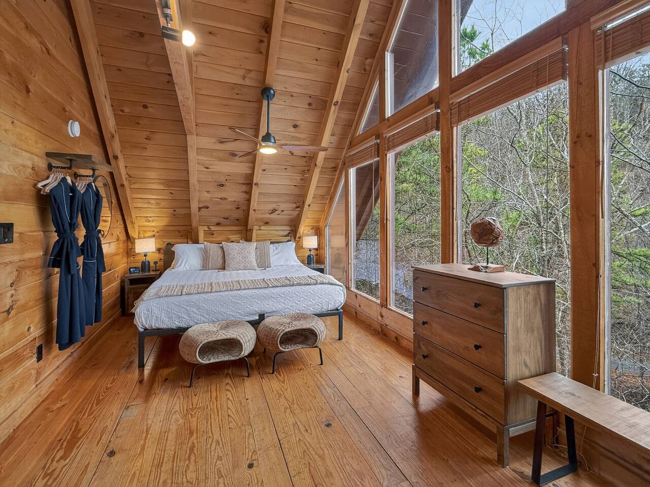 Welcome to Smoky Mountain Serenity, a luxurious haven nestled in the Smoky Mountains. Our chalet, spanning two stories, offers a serene retreat with windows all around making you feel like your in the trees. The heart of the home is the open-concept living area, featuring a cozy fireplace, plush reclining seats, and a Smart TV for your entertainment. The kitchen is a chef's delight, fully equipped with modern appliances, a Keurig coffeemaker, and all necessary cookware, making dining-in a pleasure. Adjoining the kitchen, the dining area, with its island and bar stools, is perfect for both meals and remote work. Two elegantly appointed bedrooms await you. The downstairs King suite offers a comfortable bed, smart TV, and an ensuite bathroom with a Jacuzxi tub, creating a spa-like ambiance. The upstairs king suite, a masterpiece of comfort, featuring a king size memory foam mattress and a wall of chalet windows looking into the mountains, ensuring a luxurious stay. The en suite bathrooms are modern and well-equipped, providing all essentials for a refreshing start or end to your day. Step outside to the deck, an ideal spot to enjoy the crisp mountain air and the hot tub, complete with comfortable outdoor seating. Smoky Mountain Serenity is more than just a place to stay; it's a destination in itself, offering a unique blend of modern luxury and natural beauty, perfect for those seeking a peaceful getaway in the mountains Please note there are Security cameras on the Property located outside. There is a Doorbell 24/7 camera that points towards the front door entry and the parking area. We also offer Alexa voice assistants smart home devices in the Kitchen and each bedroom as well as the TV's are all Alexa voice compatible. The Amazon Echo shows in the kitchen and upstairs bedroom have had the Camera shutters super glued shut and all voice recording features disabled for guest privacy.