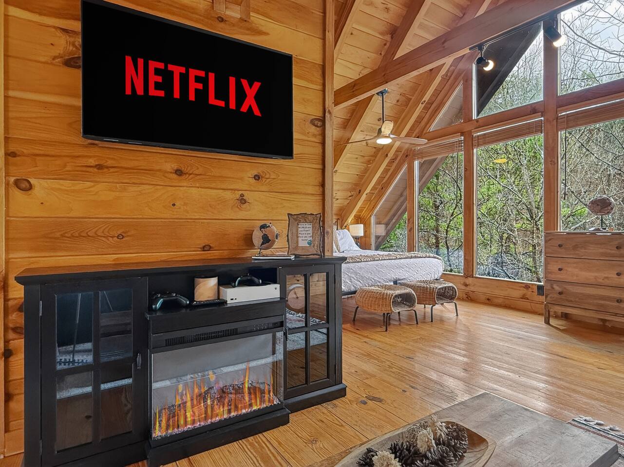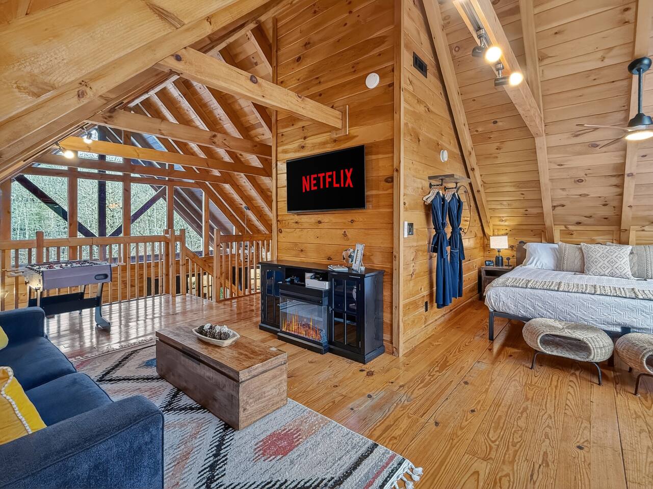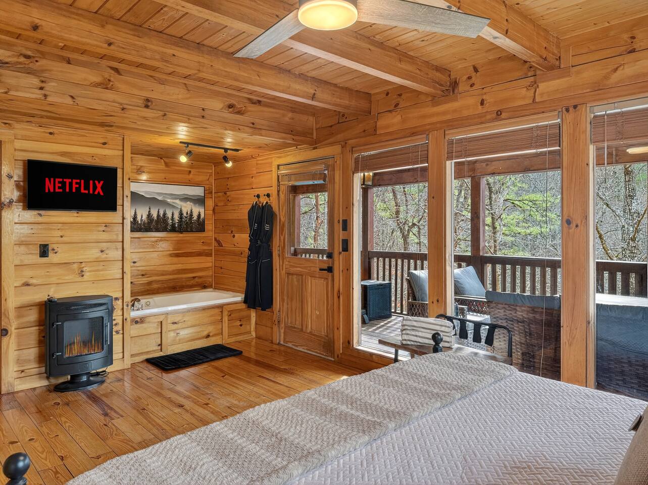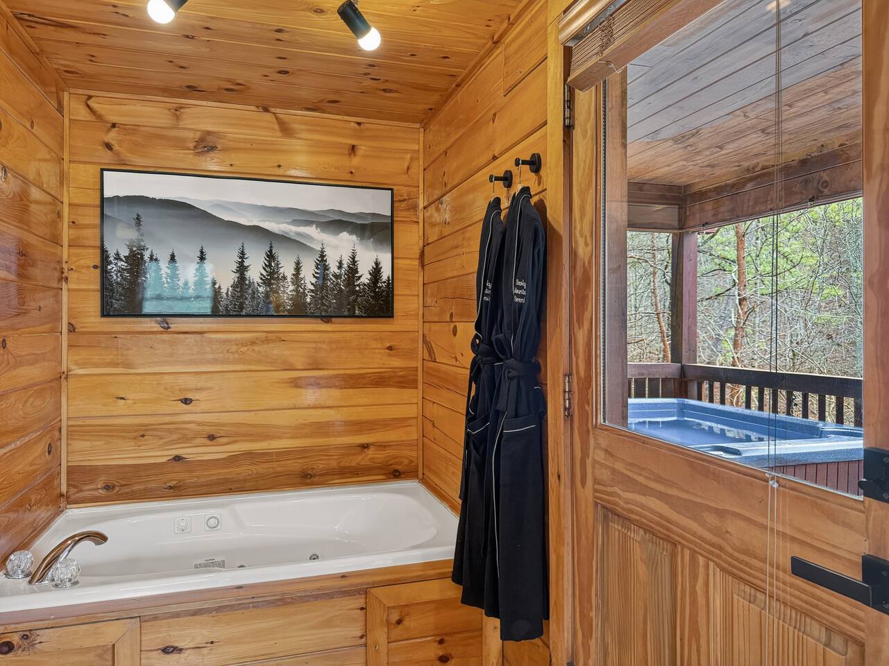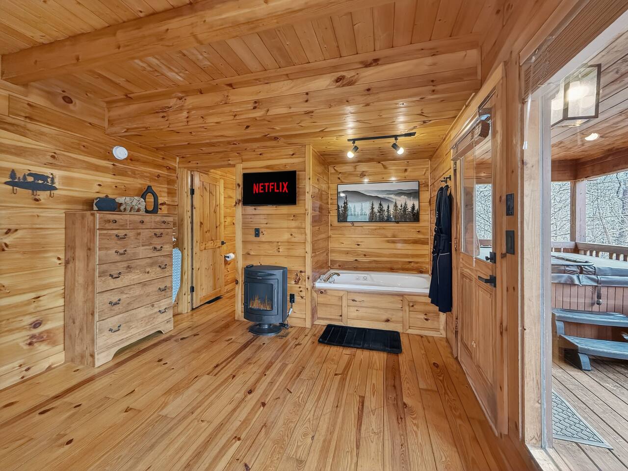 Welcome to Smoky Mountain Serenity, a luxurious haven nestled in the Smoky Mountains. Our chalet, spanning two stories, offers a serene retreat with windows all around making you feel like your in the trees. The heart of the home is the open-concept living area, featuring a cozy fireplace, plush reclining seats, and a Smart TV for your entertainment. The kitchen is a chef's delight, fully equipped with modern appliances, a Keurig coffeemaker, and all necessary cookware, making dining-in a pleasure. Adjoining the kitchen, the dining area, with its island and bar stools, is perfect for both meals and remote work. Two elegantly appointed bedrooms await you. The downstairs King suite offers a comfortable bed, smart TV, and an ensuite bathroom with a Jacuzxi tub, creating a spa-like ambiance. The upstairs king suite, a masterpiece of comfort, featuring a king size memory foam mattress and a wall of chalet windows looking into the mountains, ensuring a luxurious stay. The en suite bathrooms are modern and well-equipped, providing all essentials for a refreshing start or end to your day. Step outside to the deck, an ideal spot to enjoy the crisp mountain air and the hot tub, complete with comfortable outdoor seating. Smoky Mountain Serenity is more than just a place to stay; it's a destination in itself, offering a unique blend of modern luxury and natural beauty, perfect for those seeking a peaceful getaway in the mountains Please note there are Security cameras on the Property located outside. There is a Doorbell 24/7 camera that points towards the front door entry and the parking area. We also offer Alexa voice assistants smart home devices in the Kitchen and each bedroom as well as the TV's are all Alexa voice compatible. The Amazon Echo shows in the kitchen and upstairs bedroom have had the Camera shutters super glued shut and all voice recording features disabled for guest privacy.