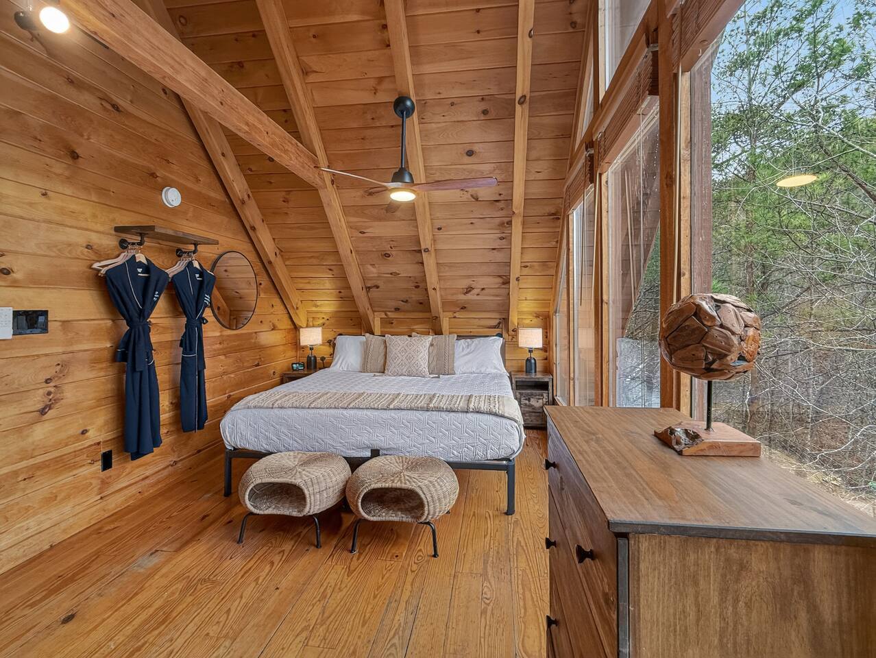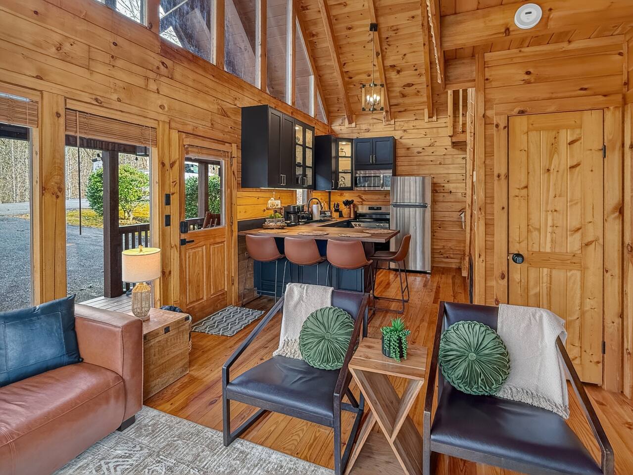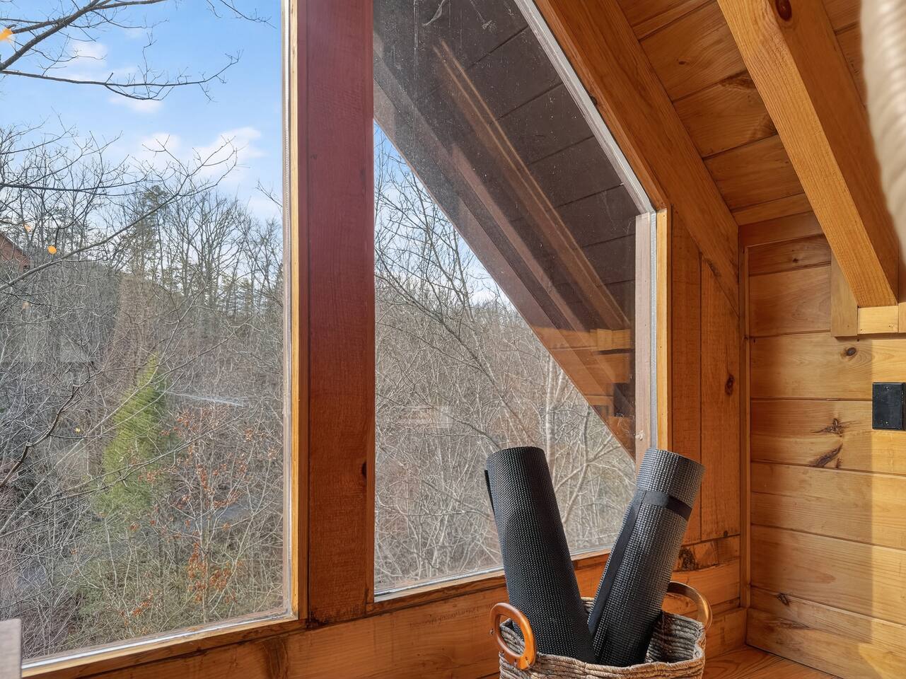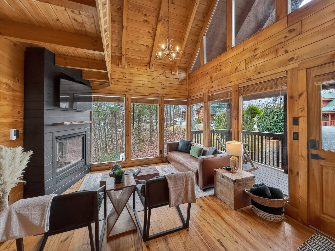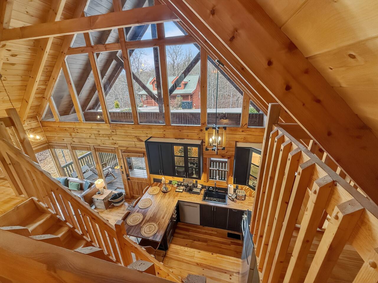 Welcome to Smoky Mountain Serenity, a luxurious haven nestled in the Smoky Mountains. Our chalet, spanning two stories, offers a serene retreat with windows all around making you feel like your in the trees. The heart of the home is the open-concept living area, featuring a cozy fireplace, plush reclining seats, and a Smart TV for your entertainment. The kitchen is a chef's delight, fully equipped with modern appliances, a Keurig coffeemaker, and all necessary cookware, making dining-in a pleasure. Adjoining the kitchen, the dining area, with its island and bar stools, is perfect for both meals and remote work. Two elegantly appointed bedrooms await you. The downstairs King suite offers a comfortable bed, smart TV, and an ensuite bathroom with a Jacuzxi tub, creating a spa-like ambiance. The upstairs king suite, a masterpiece of comfort, featuring a king size memory foam mattress and a wall of chalet windows looking into the mountains, ensuring a luxurious stay. The en suite bathrooms are modern and well-equipped, providing all essentials for a refreshing start or end to your day. Step outside to the deck, an ideal spot to enjoy the crisp mountain air and the hot tub, complete with comfortable outdoor seating. Smoky Mountain Serenity is more than just a place to stay; it's a destination in itself, offering a unique blend of modern luxury and natural beauty, perfect for those seeking a peaceful getaway in the mountains Please note there are Security cameras on the Property located outside. There is a Doorbell 24/7 camera that points towards the front door entry and the parking area. We also offer Alexa voice assistants smart home devices in the Kitchen and each bedroom as well as the TV's are all Alexa voice compatible. The Amazon Echo shows in the kitchen and upstairs bedroom have had the Camera shutters super glued shut and all voice recording features disabled for guest privacy.