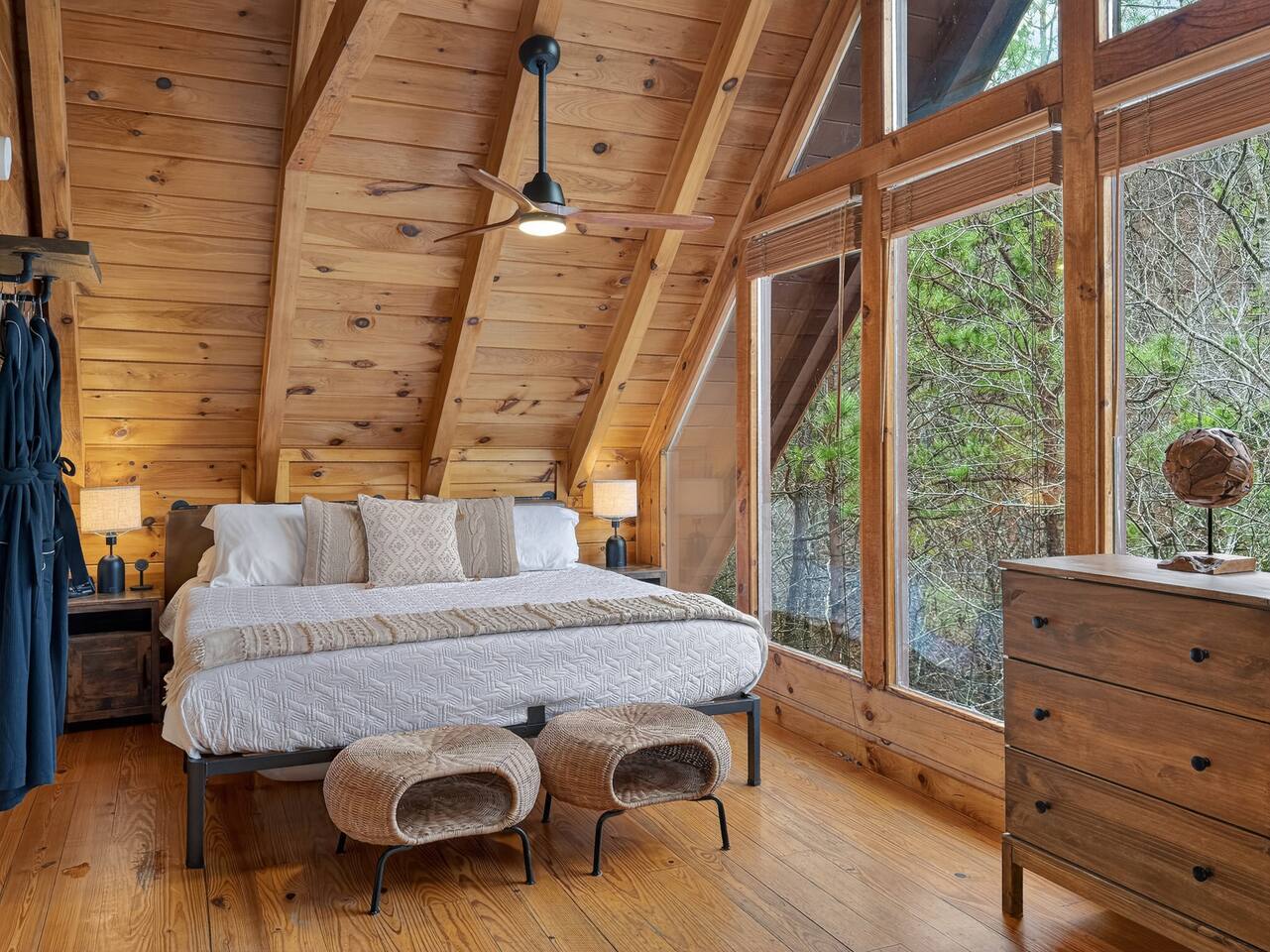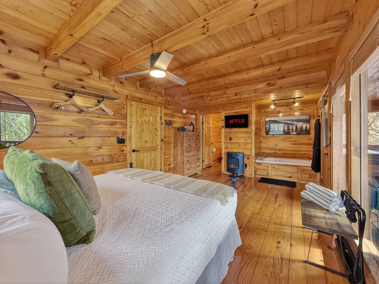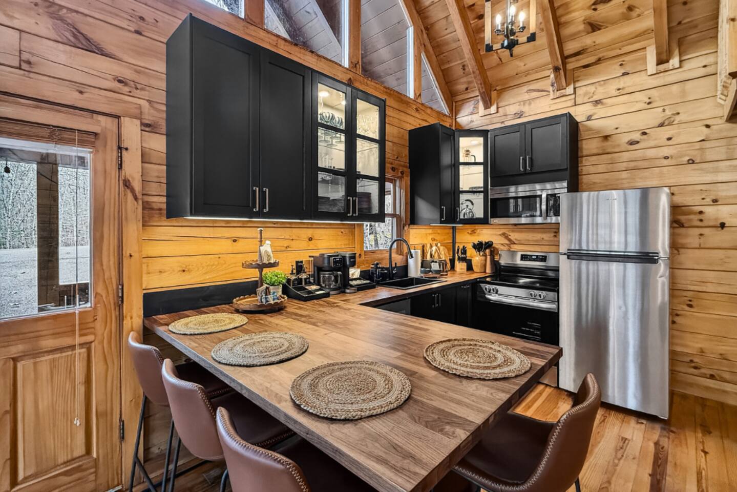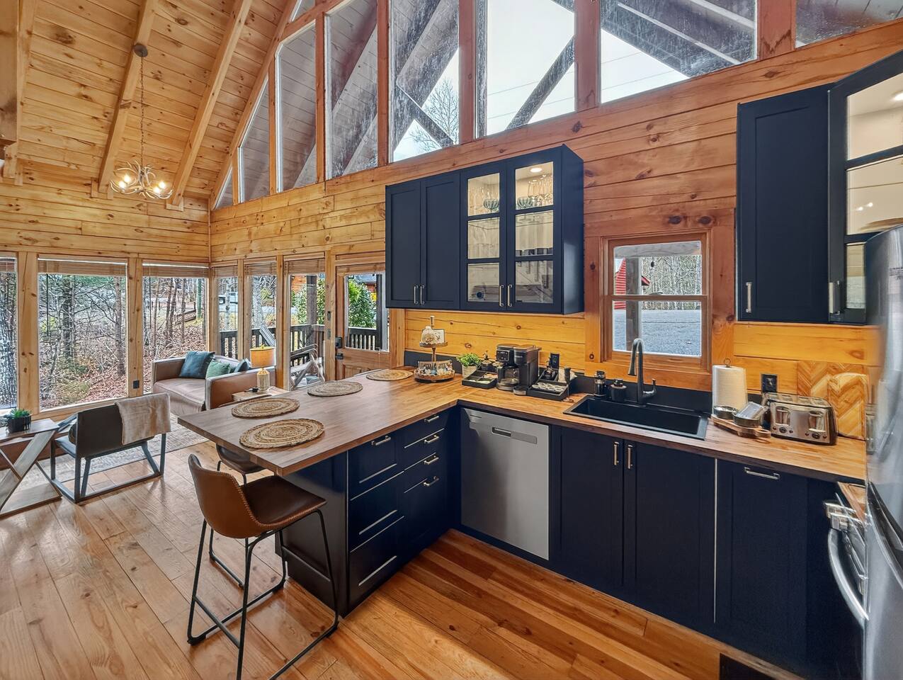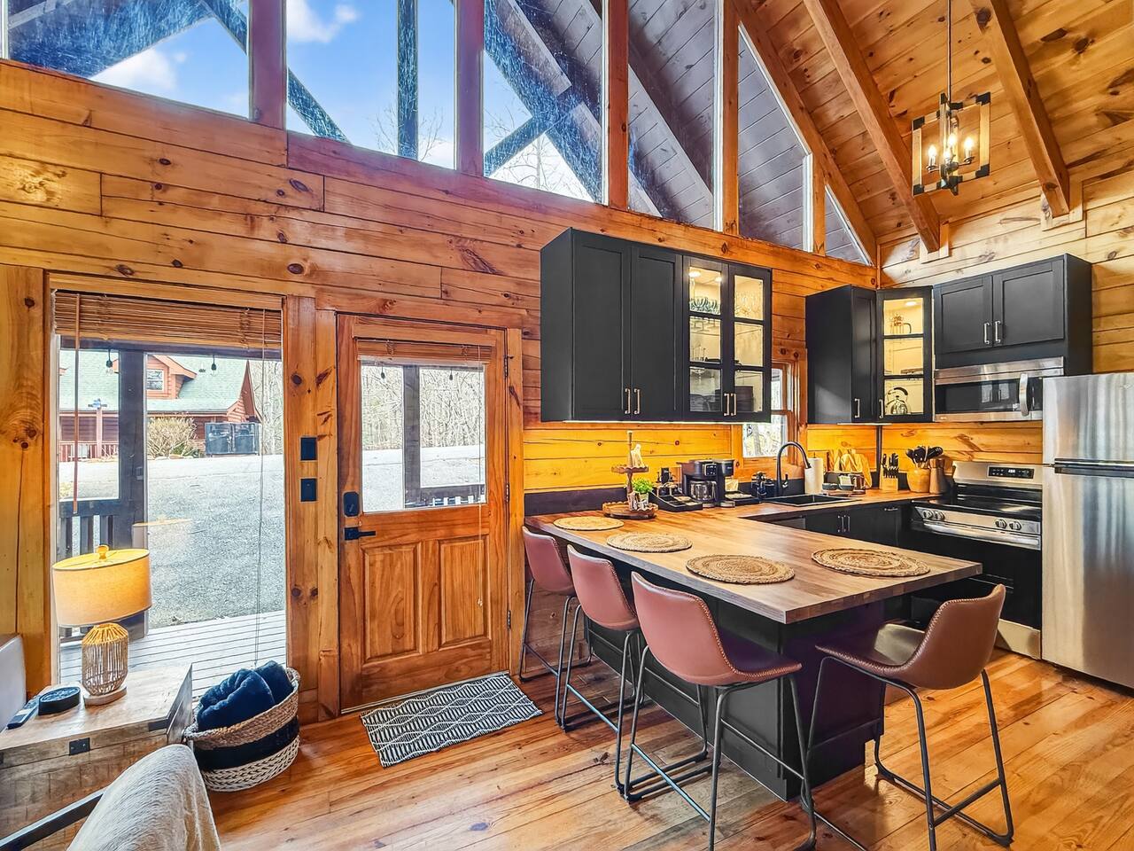 Welcome to Smoky Mountain Serenity, a luxurious haven nestled in the Smoky Mountains. Our chalet, spanning two stories, offers a serene retreat with windows all around making you feel like your in the trees. The heart of the home is the open-concept living area, featuring a cozy fireplace, plush reclining seats, and a Smart TV for your entertainment. The kitchen is a chef's delight, fully equipped with modern appliances, a Keurig coffeemaker, and all necessary cookware, making dining-in a pleasure. Adjoining the kitchen, the dining area, with its island and bar stools, is perfect for both meals and remote work. Two elegantly appointed bedrooms await you. The downstairs King suite offers a comfortable bed, smart TV, and an ensuite bathroom with a Jacuzxi tub, creating a spa-like ambiance. The upstairs king suite, a masterpiece of comfort, featuring a king size memory foam mattress and a wall of chalet windows looking into the mountains, ensuring a luxurious stay. The en suite bathrooms are modern and well-equipped, providing all essentials for a refreshing start or end to your day. Step outside to the deck, an ideal spot to enjoy the crisp mountain air and the hot tub, complete with comfortable outdoor seating. Smoky Mountain Serenity is more than just a place to stay; it's a destination in itself, offering a unique blend of modern luxury and natural beauty, perfect for those seeking a peaceful getaway in the mountains Please note there are Security cameras on the Property located outside. There is a Doorbell 24/7 camera that points towards the front door entry and the parking area. We also offer Alexa voice assistants smart home devices in the Kitchen and each bedroom as well as the TV's are all Alexa voice compatible. The Amazon Echo shows in the kitchen and upstairs bedroom have had the Camera shutters super glued shut and all voice recording features disabled for guest privacy.
