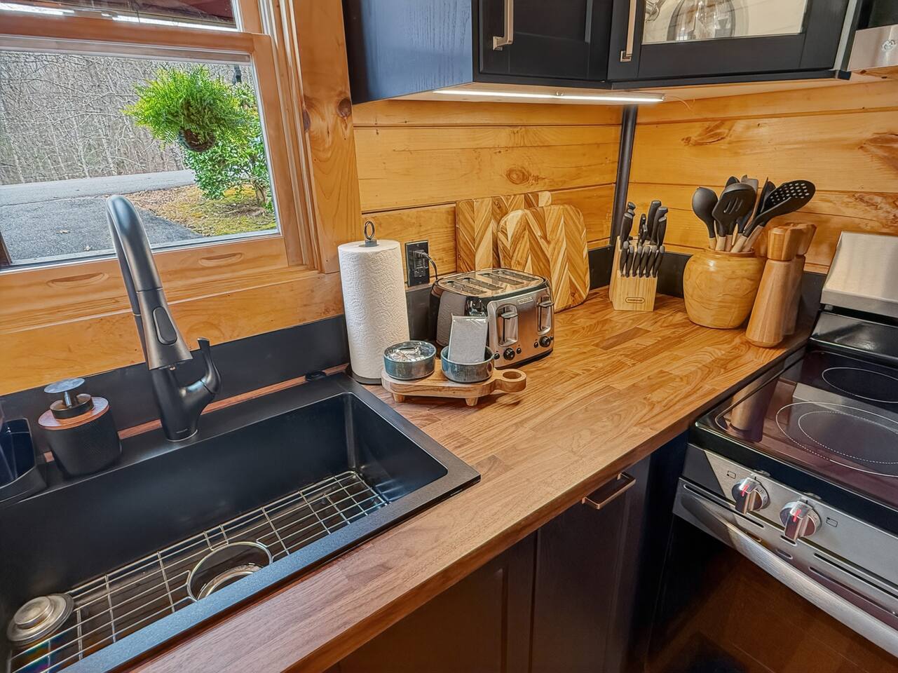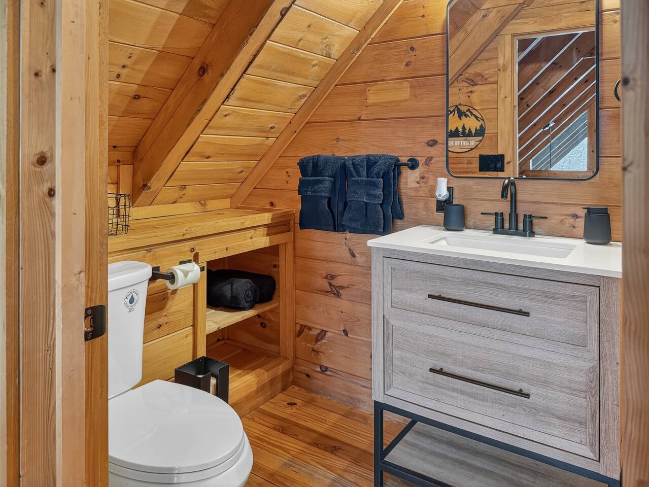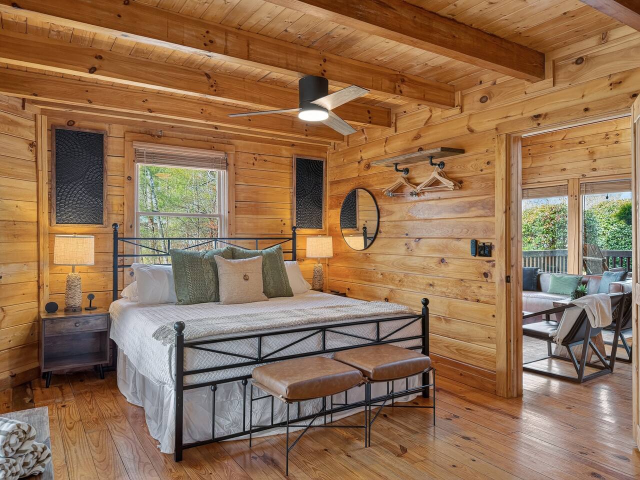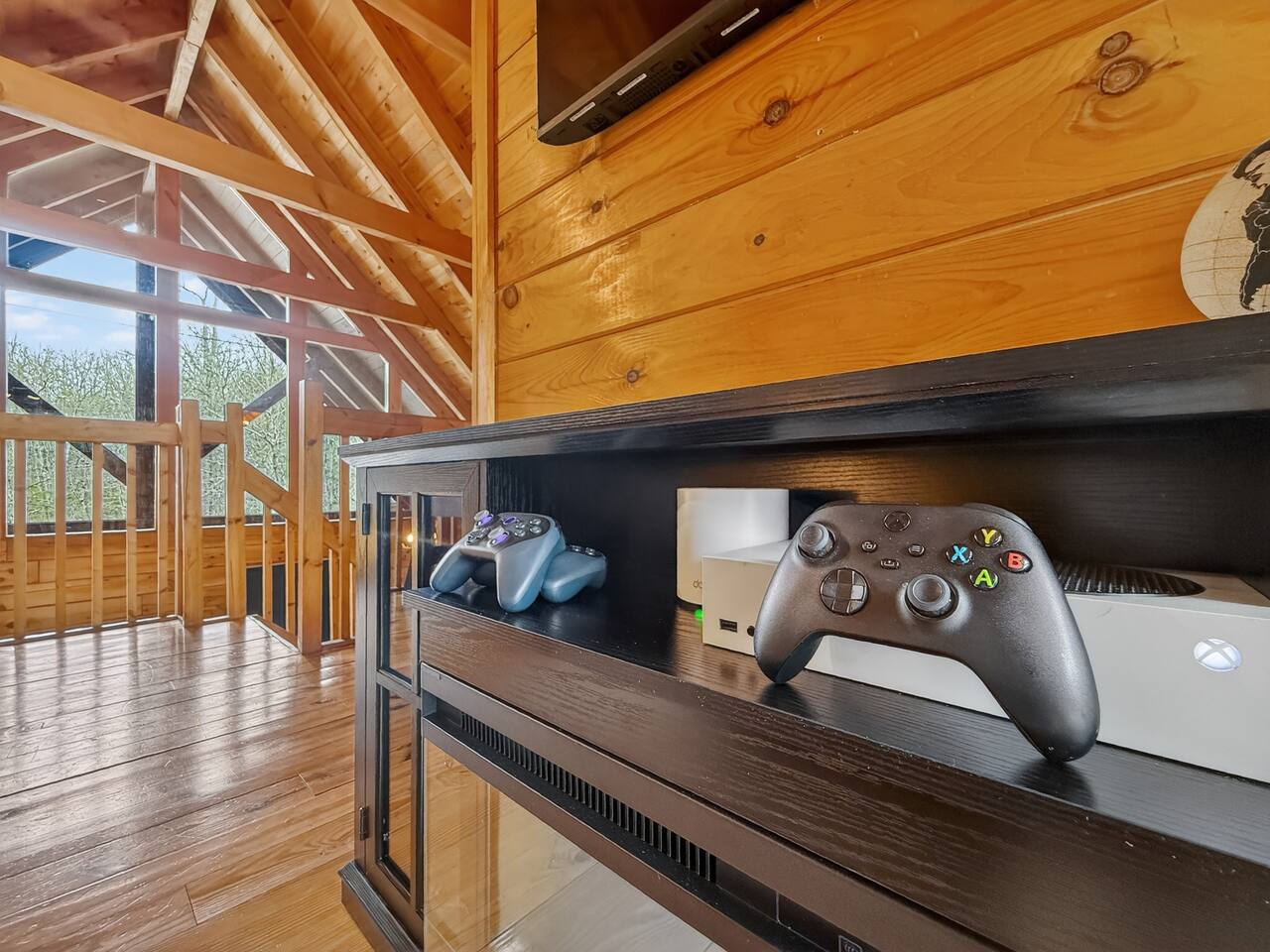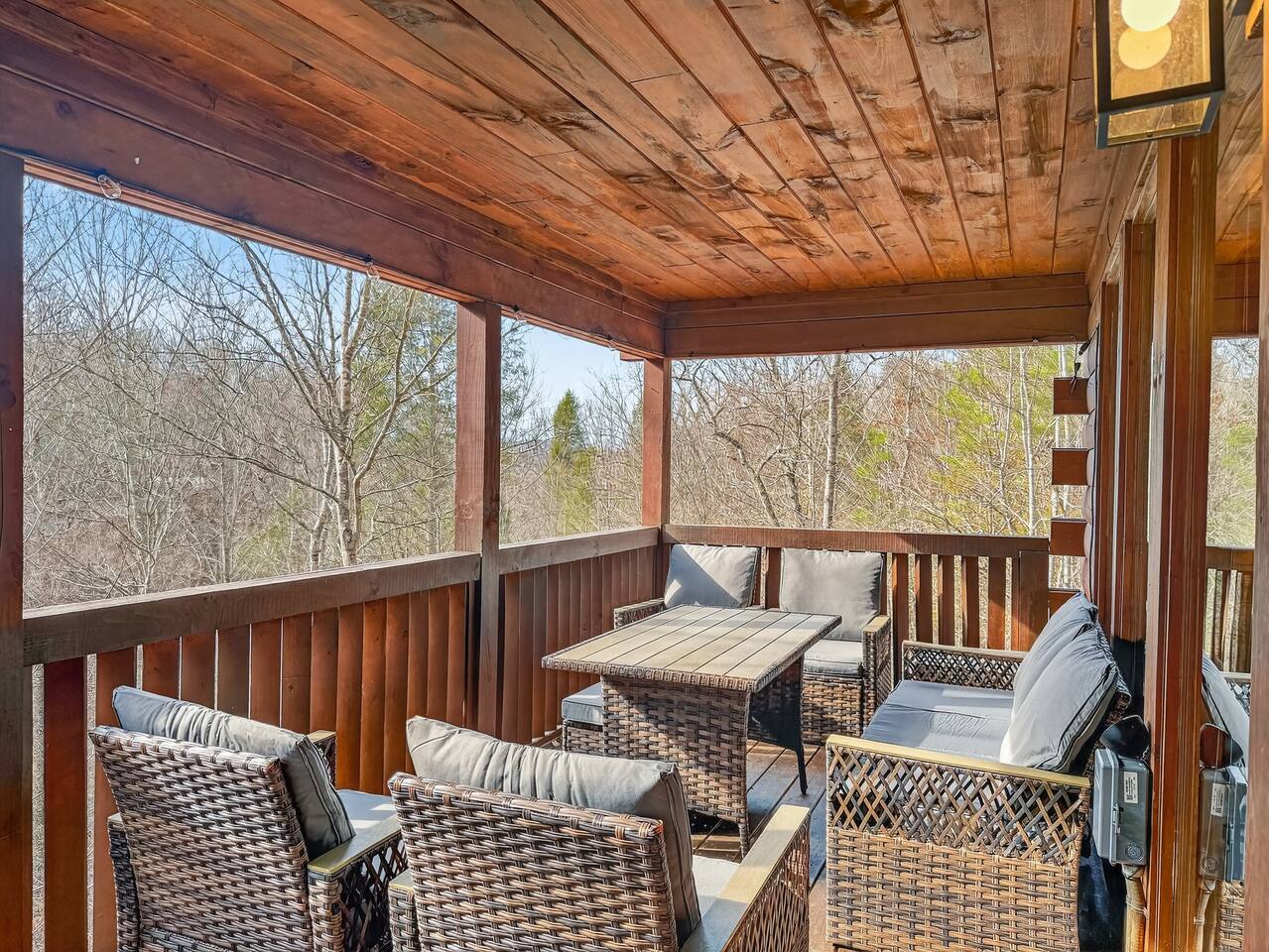 Welcome to Smoky Mountain Serenity, a luxurious haven nestled in the Smoky Mountains. Our chalet, spanning two stories, offers a serene retreat with windows all around making you feel like your in the trees. The heart of the home is the open-concept living area, featuring a cozy fireplace, plush reclining seats, and a Smart TV for your entertainment. The kitchen is a chef's delight, fully equipped with modern appliances, a Keurig coffeemaker, and all necessary cookware, making dining-in a pleasure. Adjoining the kitchen, the dining area, with its island and bar stools, is perfect for both meals and remote work. Two elegantly appointed bedrooms await you. The downstairs King suite offers a comfortable bed, smart TV, and an ensuite bathroom with a Jacuzxi tub, creating a spa-like ambiance. The upstairs king suite, a masterpiece of comfort, featuring a king size memory foam mattress and a wall of chalet windows looking into the mountains, ensuring a luxurious stay. The en suite bathrooms are modern and well-equipped, providing all essentials for a refreshing start or end to your day. Step outside to the deck, an ideal spot to enjoy the crisp mountain air and the hot tub, complete with comfortable outdoor seating. Smoky Mountain Serenity is more than just a place to stay; it's a destination in itself, offering a unique blend of modern luxury and natural beauty, perfect for those seeking a peaceful getaway in the mountains Please note there are Security cameras on the Property located outside. There is a Doorbell 24/7 camera that points towards the front door entry and the parking area. We also offer Alexa voice assistants smart home devices in the Kitchen and each bedroom as well as the TV's are all Alexa voice compatible. The Amazon Echo shows in the kitchen and upstairs bedroom have had the Camera shutters super glued shut and all voice recording features disabled for guest privacy.