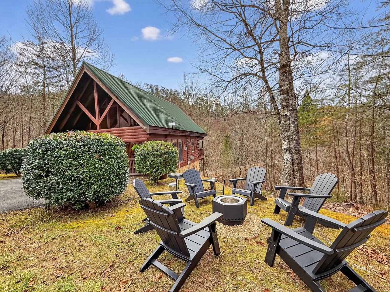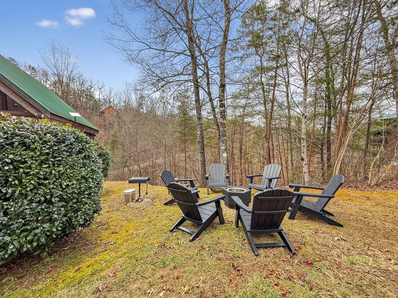 With the cabin being on the side of a mountain we please ask guests not to go down the hill past the front of the cabin it’s steep and slippery with the leaves. There is a small area out front of the cabin on either side of the driveway with open are to hang out and play corn hole, grill up dinner or enjoy the fire pit. Guests need to provide their own Fire wood and charcoal for the grill.
